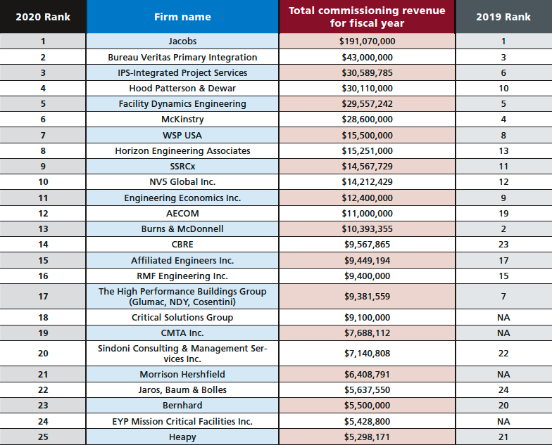 For the 2020 report, the top 25 companies made $536 million in revenue, a slight dip from last year’s $551 million. The majority (44%) of firms are consulting-engineering firms with a commissioning division; about a quarter (24%) are commissioning-focused firms. Firm ownership type fell into four categories: private (36%), public (28%), employee-owned (24%) and limited liability company (12%).